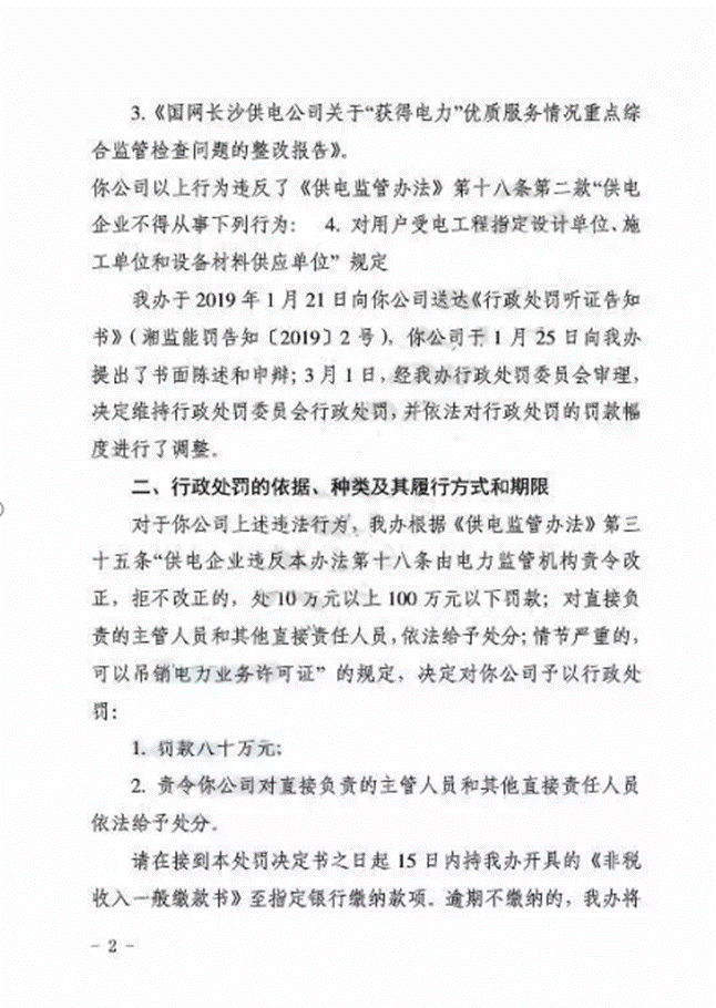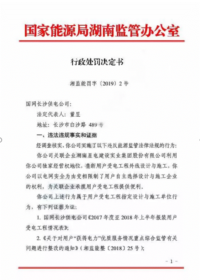 国家能源局湖南监管办公室认定国网长沙供电公司上述行为属于用户受电工程指定设计与施工单位行为,并对国网长沙供电公司予以行政处罚。