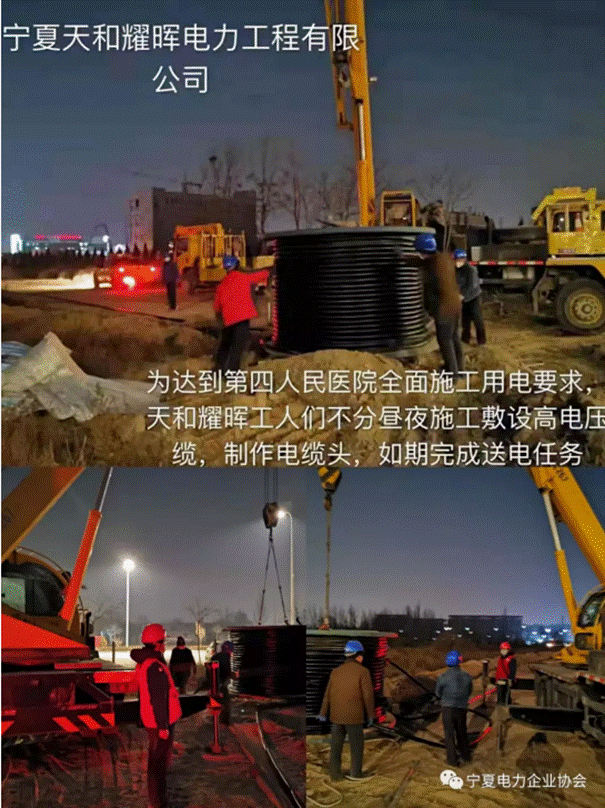 为了达到第四人民医院全面施工用电要求。天和耀晖工人们不分昼夜施工敷设高压电缆,制作电缆头,如期完成送电任务!