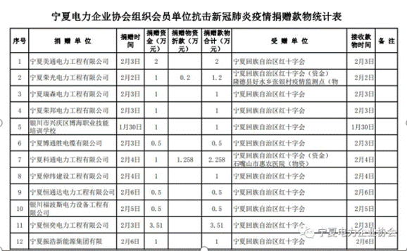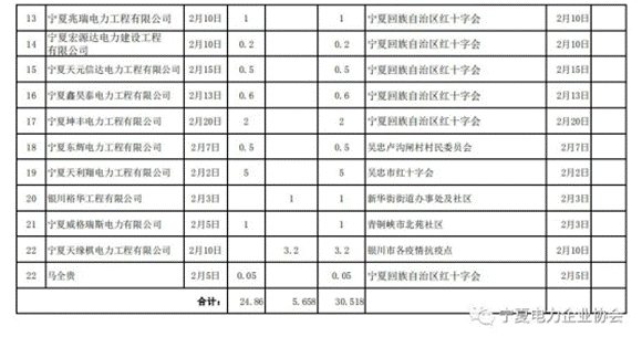 宁夏电力企业协会自2020年1月26日发出倡议以来,得到了会员单位的积极响应,以善行担起守望相助的社会责任,用义举筑就人道主义的家国情怀,展现了中华民族“一方有难、八方支援”的大爱精神。