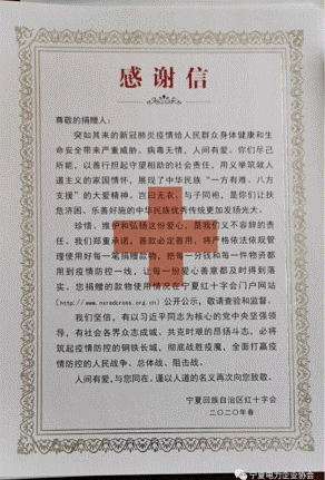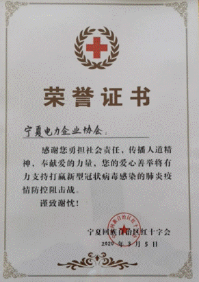 宁夏红十字会向宁夏电力企业协会颁发了“感谢您勇担社会责任,传播人道精神,奉献爱的力量,您的爱心善举将有力支持打赢新型冠状病毒感染的肺炎疫情防控阻击战。谨致谢枕!”的荣誉证书。向各会员单位颁发了捐赠证书和感谢信。